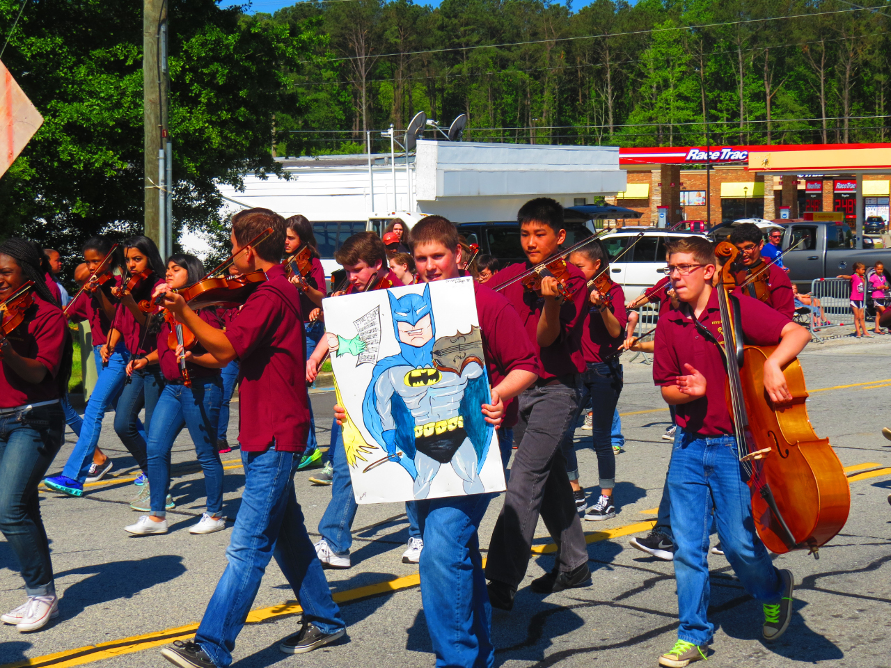 Here’s one view of the 2015 Snellville Days parade, made by Roving Photographer Frank Sharp. It’s not every parade that has a strings orchestra in the march. It was from Five Forks Middle School Eighth Grade Orchestra. Think of the problems this cello player had in transporting (and playing?) his instrument.
