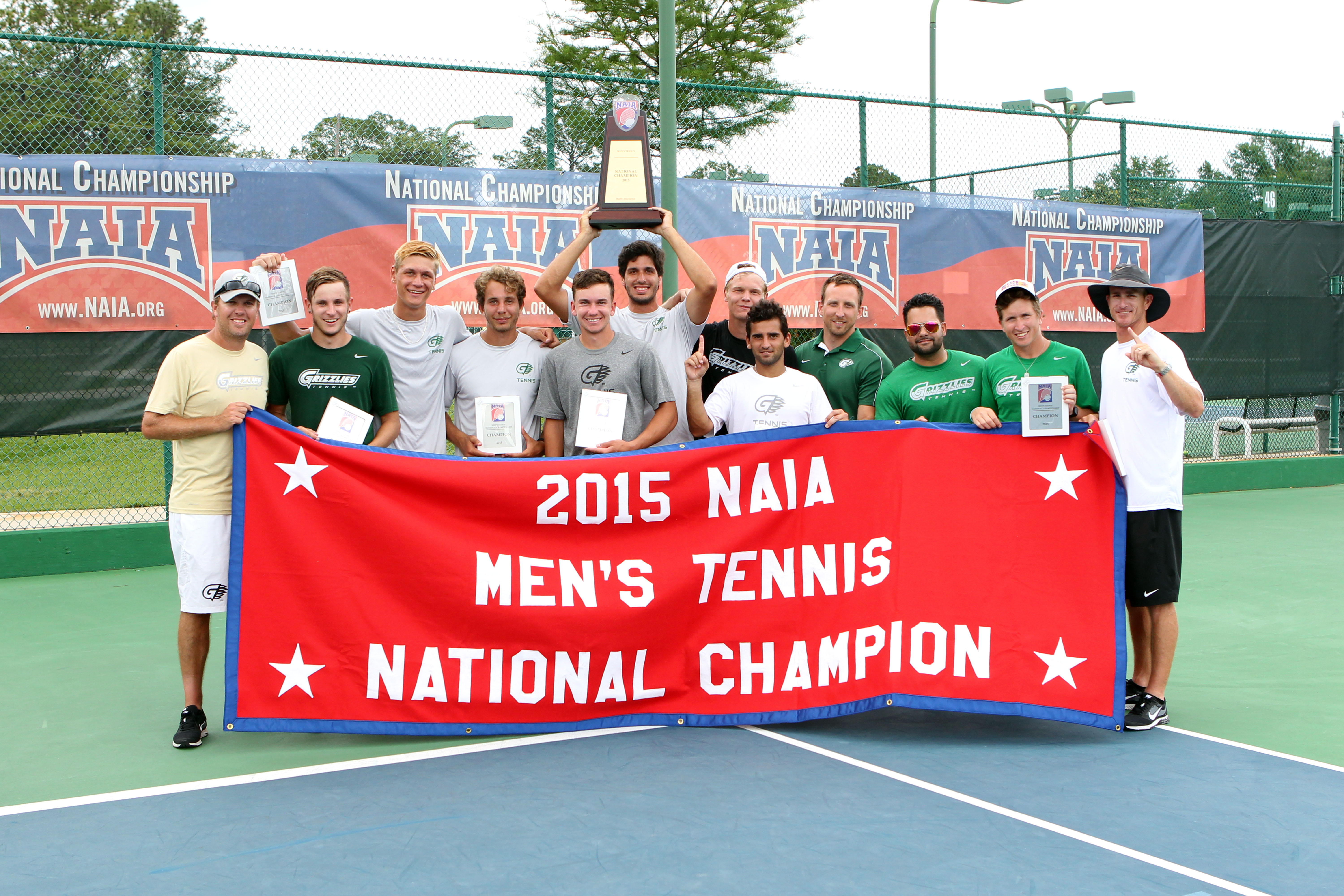 CHAMPS: The Georgia Gwinnett College men’s tennis team spent the entire season as the undisputed No. 1 National Association of Intercollegiate Athletics team. The Grizzlies ended their season by beating Embry-Riddle 5-0 to win a second consecutive NAIA National Championship at Mobile Tennis Center on Sunday. From left are Head Coach Chase Hodges, Luke Morland, Lachlan McPhee, Kevin Konfederak, Connor Clements, Tony Licata, Jordan Cox, Matias Hatem, Athletic Trainer Andy Jarosz, Assistant Coach Alex Ruiz, Assistant Coach Bruno Tiberti and Assistant Coach Adam Jackson. GGC, which now owns an 8-0 all-time record in NAIA Championship matches, finishes its second year of postseason eligibility with a 16-2 record and a 9-0 mark against NAIA competition, blanking all nine. (Photo Credit: Bill Kallenberg.)