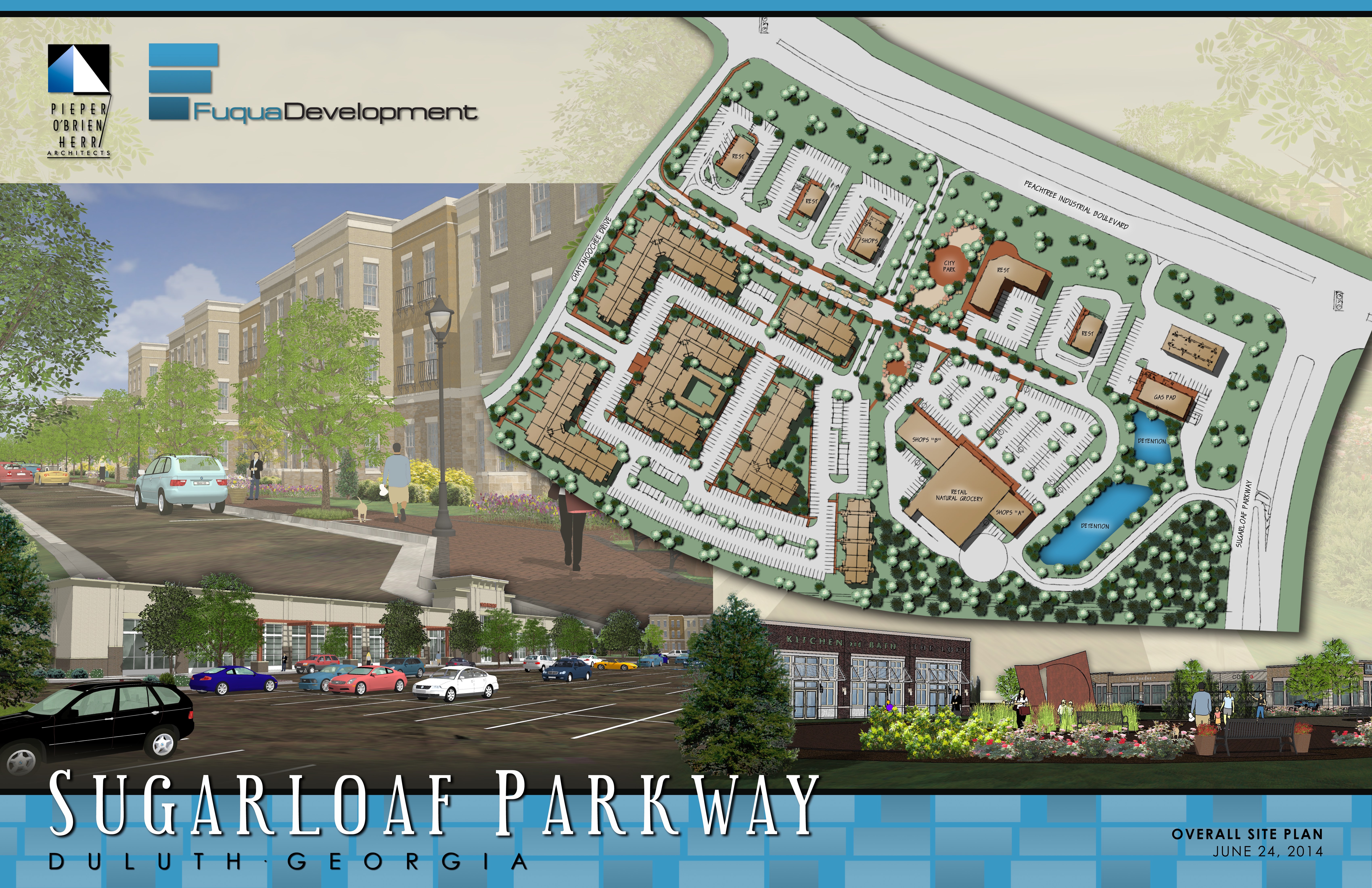 To be anchored by Sprouts Farmers Market, Sugarloaf Market will include 75,000 square feet of retail and 330 luxury apartments. Fuqua Development is the master developer for the project. Fuqua Development is developing the commercial component of the project and The Worthing Companies is developing the residential component.