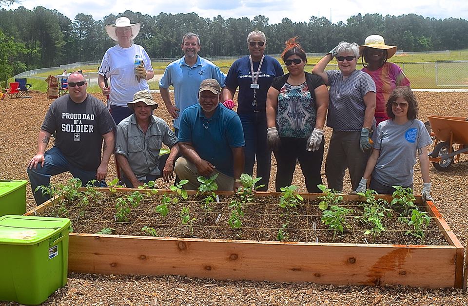 is to remove kudzu by hand. On another day, local church leaders, parents and alumni of NPD’s Hispanic Citizen’s Police Academy worked with Gwinnett Tech’s “Sustainable Urban Farming” Teacher Tony Gobert to build the garden’s first four raised beds. Soon afterwards, another group of volunteers recycled concrete blocks and landscape timbers from the old school site, slated for demolition in June.