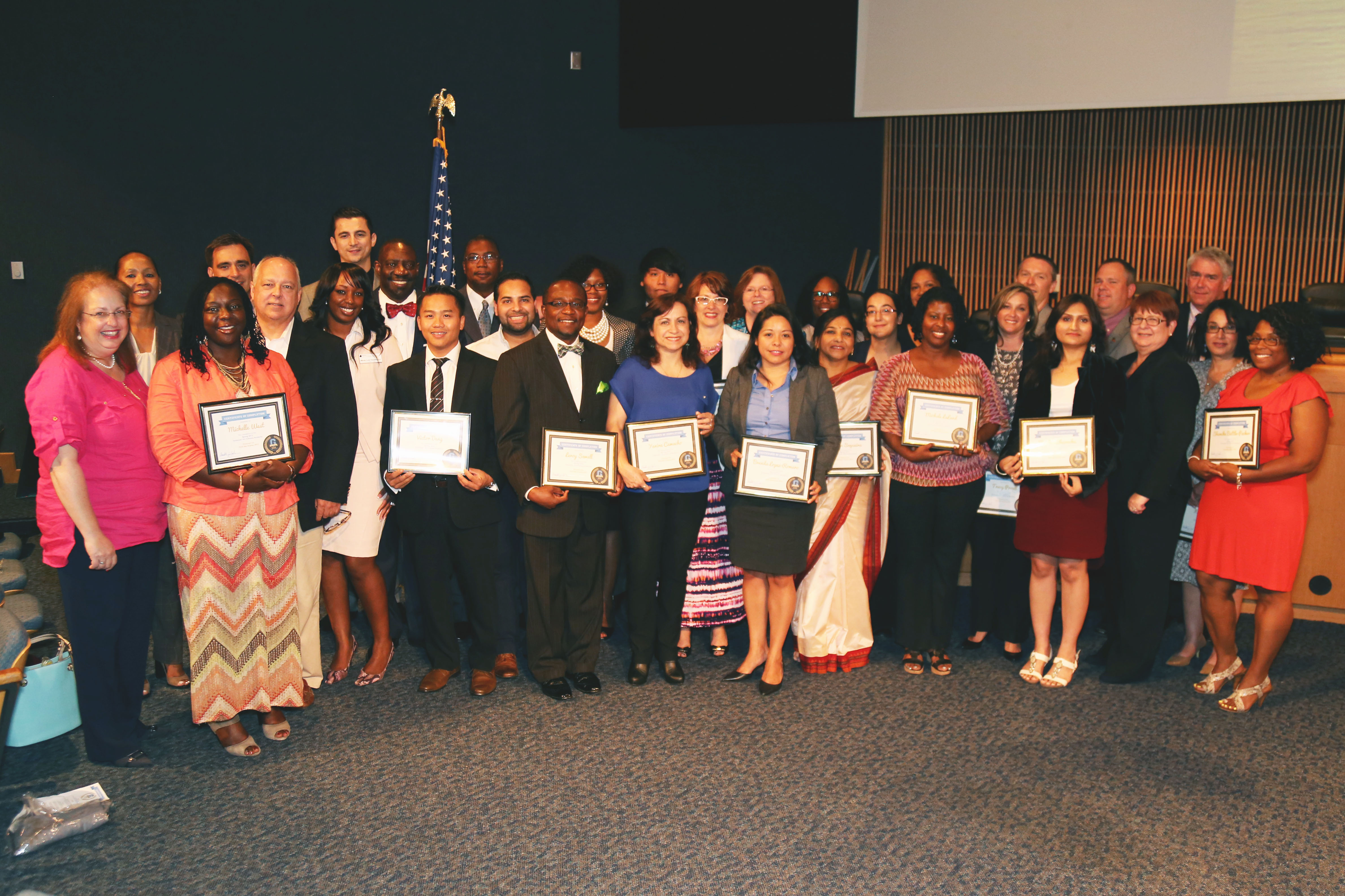 Members of the first class include, front row from left,: Michelle West, Victor Dang, Leroy Sewell, Yanira Camacho, Sharon Sequeira, Brenda Lopez, Michelle LaLand, Meghna Bharucha, Chairman Charlotte Nash, Italia Metts and Shamika Battle-Packer; On the second row are District 2 Commissioner Lynette Howard, District 4 Commissioner John Heard, Nicole Love-Hendrickson, Antonio Molina, Jennifer Hendrickson, Reem Bajes and Tracy Proell; on the top row are Vivian Burell, Tugay Angay, Darel Duliman, Gary Bailey, Craig Newton, Latabia Woodward, Luis Montes, Lisa Burelson, Annie Davis, Kimberly Westbrooks, District 1 Commissioner Jace Brooks, District 3 Commissioner Tommy Hunter, and Paul Kelley. Not pictured is Gerri Smith.
