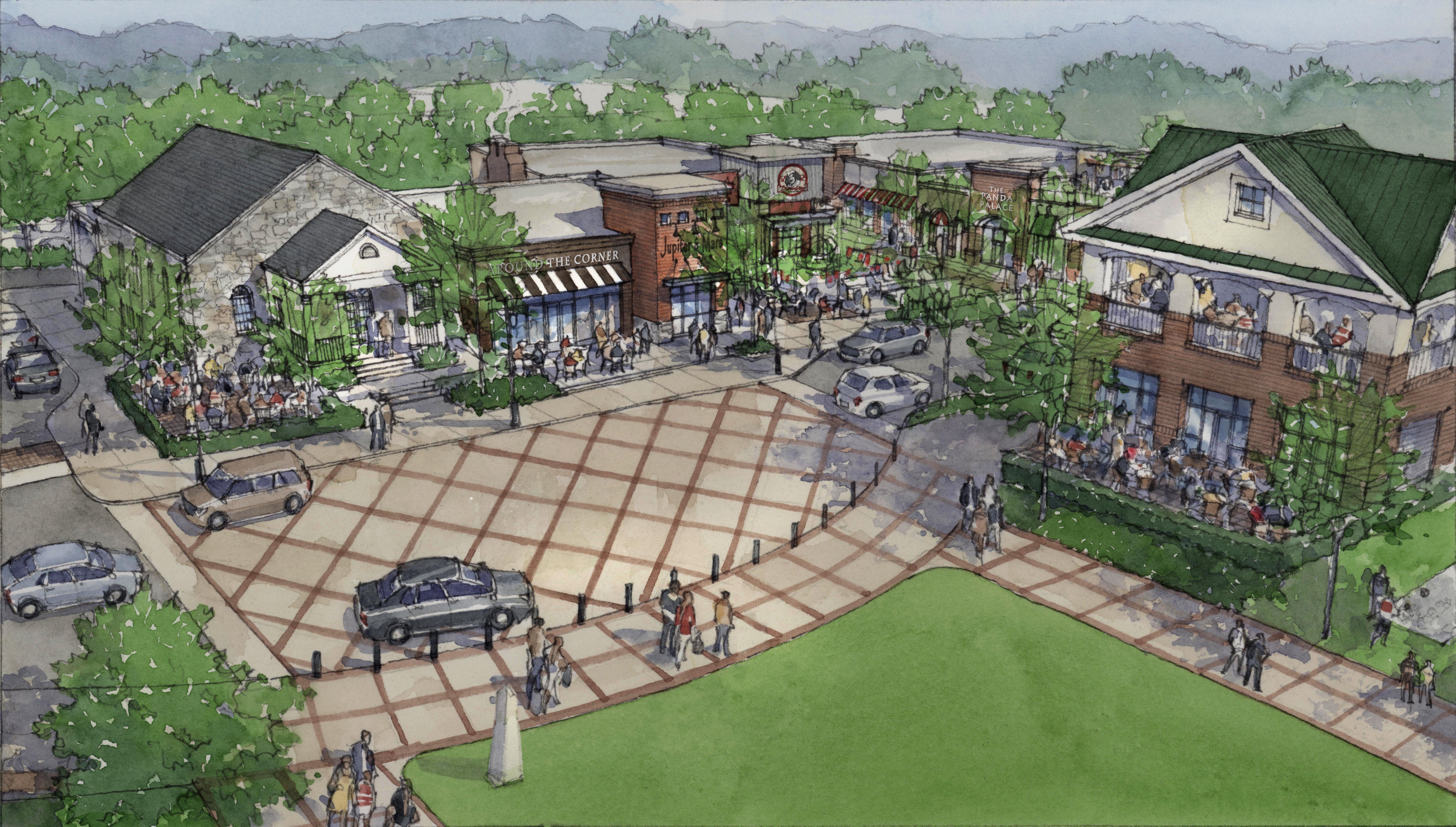 DULUTH DOWNTOWN RENDERING: Here is a rendering of what part of downtown Duluth will look like in the future. The gray building at the left was at one time the First Baptist Church, and later Duluth City Hall. One of the features of this newly-designed area will be the location of Dreamland Barbecue, previously located in Peachtree Corners. Demolition work will be completed in mid-August, with the re-building of this part of downtown Duluth anticipated to be completed by February, 2015. The firm of Fabric Design of Decatur is the developers of the site.
