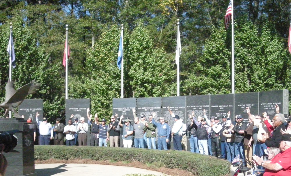 VETERAN’S DAY in Gwinnett was marked with a ceremony at the Fallen Heroes Memorial at the Gwinnett Justice and Administration Center. The keynote speaker was Dr. Stanley C. “Stas” Preczewski, president of Georgia Gwinnett College and retired U.S. Army Colonel. Dr. Preczewski called for an “Action Day” and not just a ceremony to be celebrated once a year. He ended a list of challenges with this quote: “The road is less traveled in the extra mile.” The ceremony was ended by the laying of the wreath, three rifle volleys and taps. The Philadelphia Winn Chapter National Society Daughters of the American Revolution hosted a reception after the ceremony for veterans and their families.