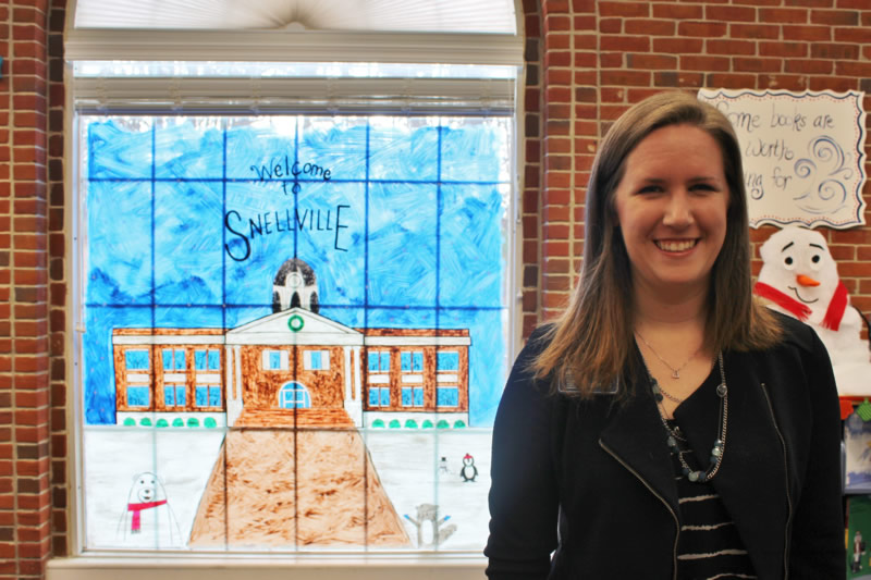 Browning has been periodically painting murals on one of the large windows inside the library on Lenora Church Road. When it came time to paint a wintery scene, she chose Snellville City Hall. The painting, shouting “Welcome to Snellville” includes snow on the ground and a polar bear and penguin.