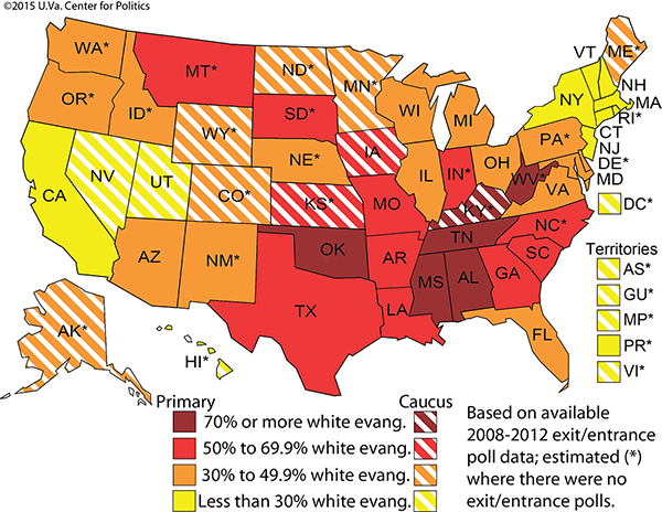 A large and important of the voting body this year will be white evangelicals. The University of Virginia Center for Politics in 2015 produced a map showing where they are most prominent, and not all centered in the south. Look at Montana, South Dakota and Indiana!