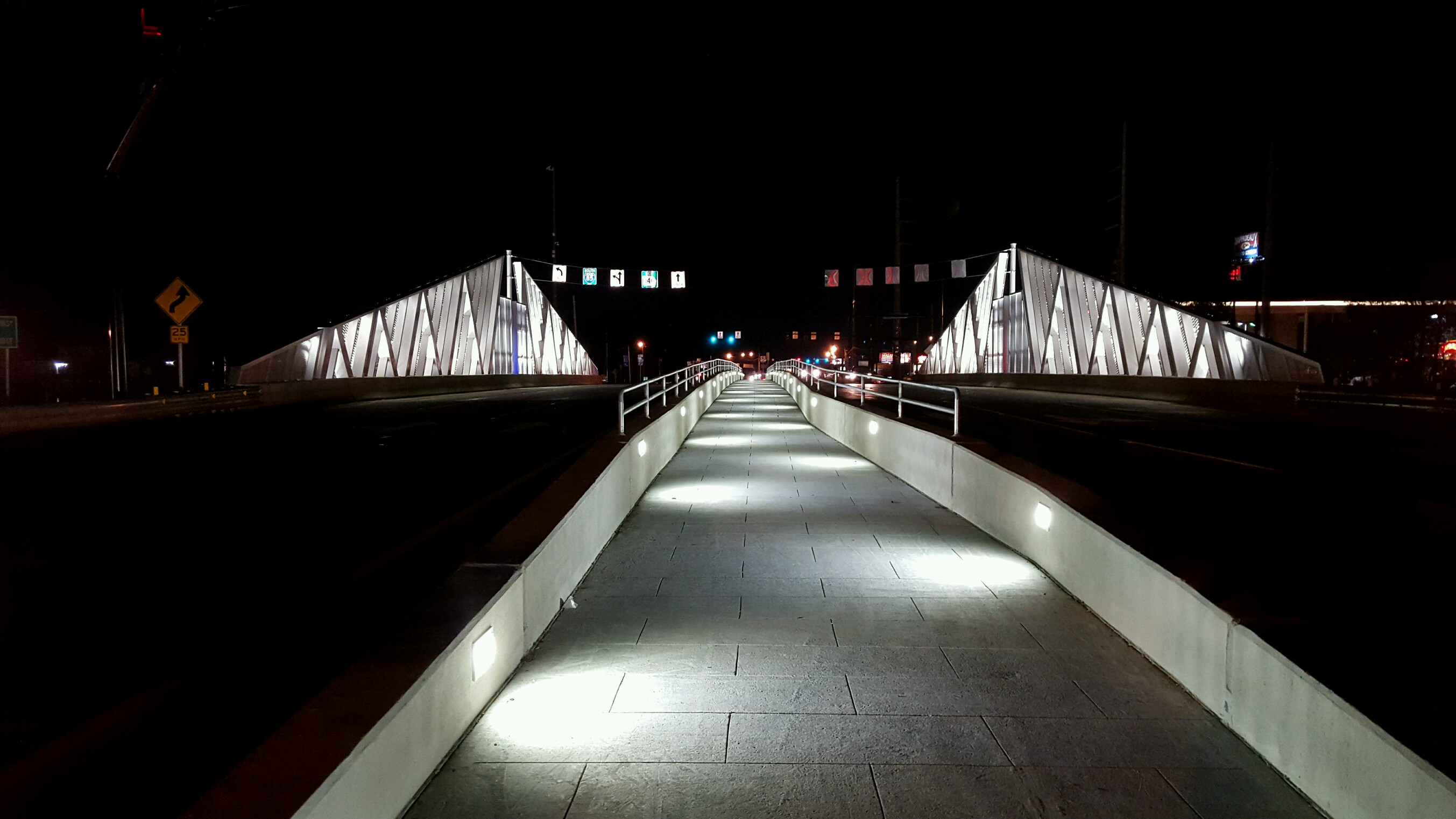 Something from outer space? No, it’s most local, and now lighted at night, the Diverging Diamond bridge at Jimmy Carter Boulevard and Interstate 85. The project is nearing completion and had the lighting feature turned on last week. This is the center pedestrian walkway, with traffic flowing beyond the barriers. When someone asked at a meeting where was the best place to observe the bridge lighting, another person quickly responded: “When stopped at night in a traffic jam on Interstate 85.” (Photo by Gwinnett DOT.)