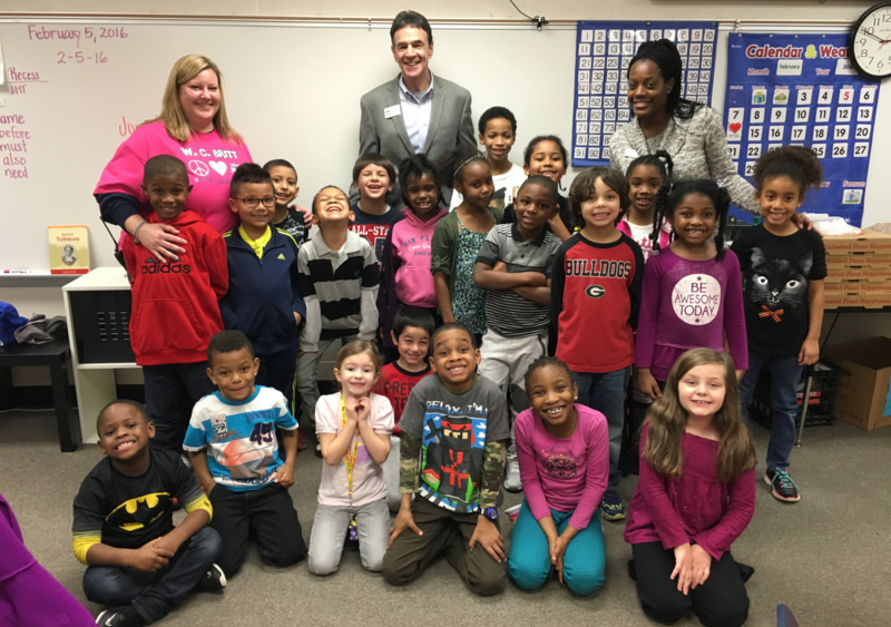 Ms. Alaina Moore’s first grade class at Britt Elementary School was joined by Councilman Dave Emanuel, who with his wife Kathy, created Give Hunger the Boot, an organization which feeds the area’s needy. GHTB was the guiding force in the city in collecting canned goods and money for the contest which Snellville won.