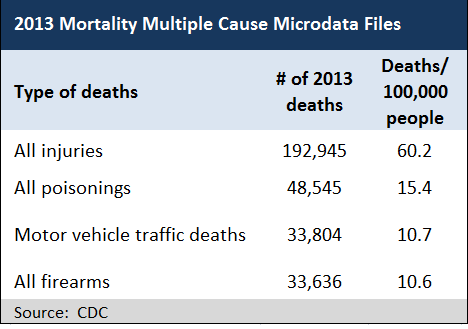 We cite the figures to show the extent of the mortality from other than natural causes in our country. Added together, that’s 36.7 deaths per 100,0000, or 115,985 of the 160,945 injury deaths in 2013. This accounts for 72 percent of these uncommon deaths.