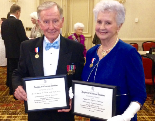 Major James N. Freeman of Lilburn, U.S. Army, Retired, is the Georgia state winner of the Daughters of the American Revolution Outstanding Veteran Volunteer Award. Major Freeman was nominated by the Lawrenceville Philadelphia Winn Chapter of the DAR. He is also the winner of the Southeastern Division (Alabama, Florida, Georgia, Mississippi, North Carolina, South Carolina, and Tennessee) and is now a national finalist. He is shown with his wife, Peggy, who is a past regent of the chapter. The DAR Outstanding Veteran Volunteer Award national winner will be announced at DAR’s Continental Congress in Washington, DC, in June. Meanwhile Peggy Duncan Freeman won the Georgia State Society’s prestigious Outstanding DAR Service for Veterans Award for her years of outstanding and tireless work to support veterans. Some 15 members of the Philadelphia Winn chapter from Gwinnett attending the 118th state conference in Augusta. (Photo by Valerie Craft.)