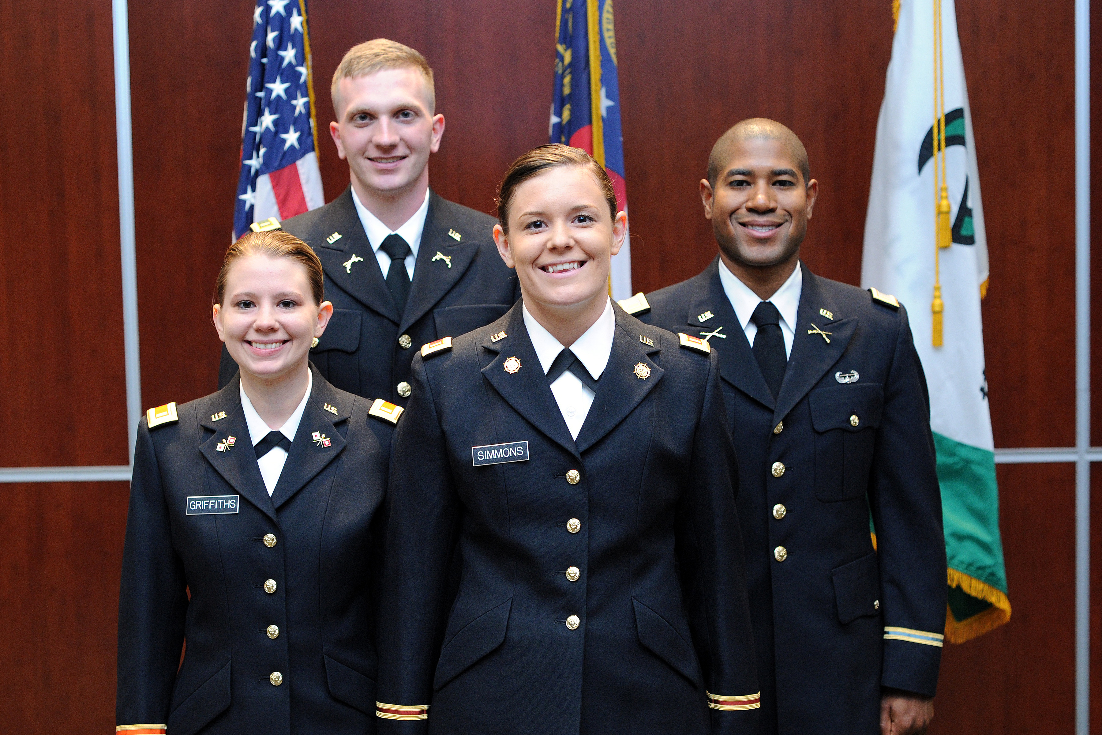 NEW OFFICERS: When Georgia Gwinnett College held its May 12 commencement ceremony, it more than doubled its number of U.S. Army officer graduates by commissioning four at once, including its first two female officers. Getting second lieutenant bars were, on the front row, is Ashleigh Simmons, 21, of Lawrenceville, who graduated with a bachelor’s degree in criminal justice, and hopes to pursue a position with the Federal Bureau of Investigation. She will begin her career as an Active Duty officer in the Transportation Corps. Next to her is Alicia Griffiths, 23, of Loganville, to go into the Signal Corps. On the back row are Adams Robes, 21, of Lawrenceville, a major in psychology, to join the military police, and Andrew Lee, 24, of Lawrenceville, going into the Infantry. His degree is in international business.