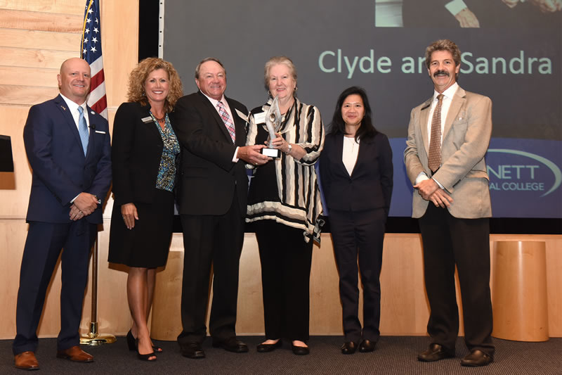 BENEFACTORS OF THE YEAR at Gwinnett Tech are Clyde and Sandra Strickland, center.  Others in the photo are President Glen Cannon; Mary Beth Byerly, vice president of institutional advancement; Angie Wood, Foundation board chair; and Dan King, Foundation board member. In his state of the college address, Dr. Cannon said that the college has come a long way in 32 years. “When the doors opened in 1984, there was just one building and a few hundred students. Today, there are two state-of-the-art campuses with a multitude of buildings that span more than 112 acres. The new Alpharetta-North Fulton Campus opened on Jan. 6, 2016, and this fall, 845 students have enrolled. Now, the College’s total enrollment, including credit, continuing education and adult education programs, tops 19,500 students. Enrollment numbers for Fall 2016 is expected to be the highest in College history.”