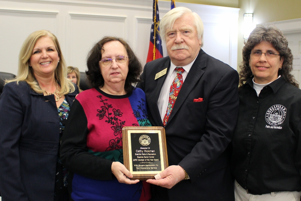The Snellville Senior Center Volunteer of the Year is Cathy Rickman, second from left, shown being presented with a plaque by Snellville Mayor Tom Witts. Senior Center Director Kathi Gargiulo is at the left, and Parks and Recreation Director Lisa Platt is at the right. Gargiulo says of Rickman: “Her willingness to be wherever she is needed has been such a contribution to the success of the Senior Center. If not for volunteers like Cathy, we would not be able to provide the amount and the quality of programs that we currently offer, always with a smile on her face.” Rickman also volunteers regularly at her church as a youth adviser, a counselor, in the Woman’s Club and as part of the annual craft auction. She enjoys making wreaths, cards, scarfs and other crafts. She also enjoys cross-stitching, scrapbooking and painting.