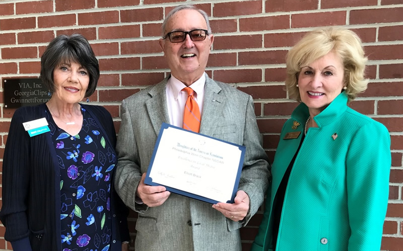 The Philadelphia Winn Chapter of the Daughters of the American Revolution (DAR) of Lawrenceville has honored GwinnettForum with an award for Excellence in Local Media. Regent Kitty Watters says that “GwinnettForum and Elliott Brack consistently promote the work of Philadelphia Winn Chapter as well as all things Gwinnett! First and foremost, Elliott is a newspaper man. To list all of his past and present accomplishments and activities would fill a book! It is his dedication to the state of Georgia, especially Gwinnett County, and the work of selfless volunteers that keeps him engaged in the important issues, year after year.” Ms. Watters is at the right, with Corresponding Secretary Lee Schermerhorn flanking the honoree.
