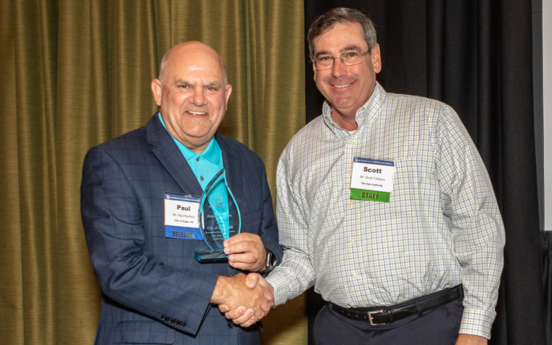 The Municipal Gas Authority of Georgia has recognized the City of Sugar Hill for marketing excellence. The award is presented annually to municipally-owned natural gas systems served by the Municipal Gas Authority of Georgia for unique marketing initiatives. The City of Sugar Hill was recognized for its E-Center project, which will include state-of-the-art gas heating and water heating appliance technologies. Sugar Hill City Manager Paul Radford is shown with Scott Tolleson, director of the Municipal Gas Association of Georgia. The City of Sugar Hill is constructing a 43,000 square foot downtown centerpiece that will include office, retail, and restaurant space, a community gymnasium, theater, and other amenities. The City incorporated natural gas technologies in the design of the facility, including five 14-ton, 3-pipe, and one 8-ton Yanmar Gas Heat Pumps totaling 78 tons, as well as nine Rinnai tankless