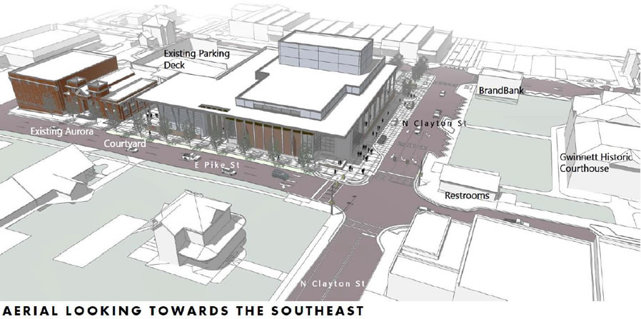 The facility will be constructed on the block surrounded by Pike, Clayton and Crogan Streets with its front entry opening onto Clayton Street across from the Historic Gwinnett County Courthouse grounds. The Aurora Theatre will contract with the city to manage, operate and craft programming for both its current venue and the future facility being proposed. Aurora Theatre has been noted for its growing economic impact regionally each year with scores of regional and national awards that have elevated it to be the second largest professional performing arts theatre in the State of Georgia.