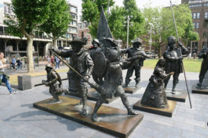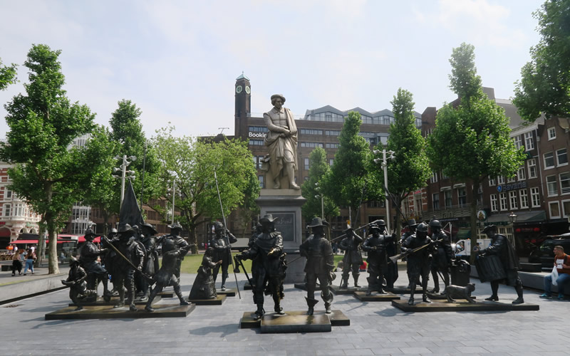 Allan Peel of San Antonio, Tex. sent not only details, but the photo of the original Rembrandt painting  which inspired the statues. (See at right). He adds: “The mystery photo is of a bronze-cast representation of Rembrandt’s famous painting ‘The Night Watch.’ Located in Rembrandt Square (Rembrandtplein) in Amsterdam, these sculptures are collectively called ‘The Night Watch in 3D,’ and was created by Russian artists Mikhail Dronov and Alexander Taratynov in 2006 as part of the celebration of Rembrandt’s 400th birthday. Although not visible in the mystery photo, these works are congregated around a statue of Rembrandt created by Louis Royer in 1852 and moved to the square in 1876. This bronze-cast representation of the famous painting was on display for three-years (2006 – 2009) before traveling to New York City, Moscow and Oranienbaum, Russia. In 2012, the bronze Night Watch sculptures returned to the square where they serve as a magnet for visitors.”