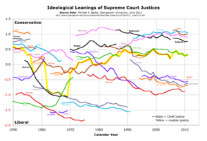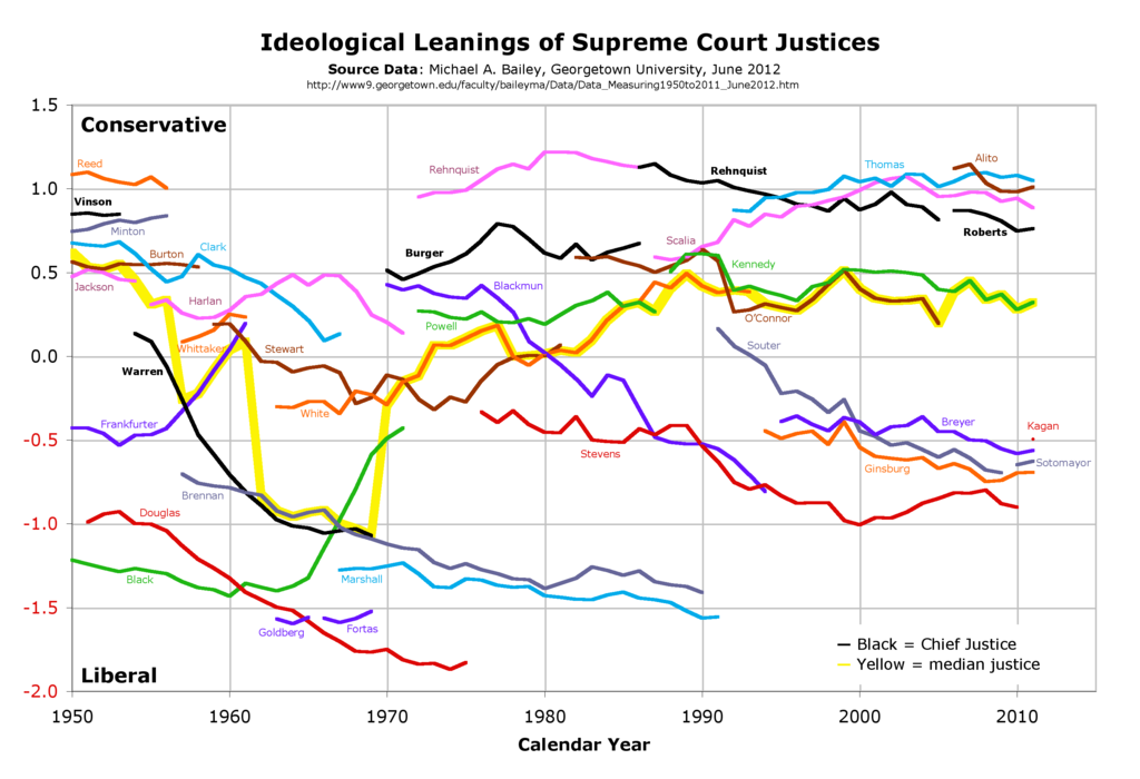 TAKE A LOOK at what one source shows are the ideological recent leanings of the jurists of the Supreme Court. You have to follow the color lines of the different justices to understand this chart. The source is Michael Bailey of Georgetown University. For further comment on what has happened ideologically to the Court since 1950, see Elliott Brack’s perspective below. (Chart by Randy Schutt [CC BY-SA 3.0], from Wikimedia Commons.)