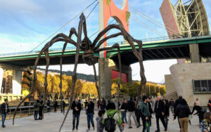 Allan Peel of San Antonio, Tex. added this: “Under the main body, there is a sac containing 32 marble eggs and its abdomen and thorax are made of ribbed bronze. The title of the sculpture ‘Maman’ is the familiar French word for Mother (akin to Mummy). The spider with its egg sac was intended to represent the strength of Bourgeois’ mother, who was a woman who repaired tapestries in her father’s textile restoration workshop in Paris. The spider structure offered the perfect metaphors of spinning, weaving, nurture and protection to reflect her mother’s trade and character strengths. When Louise Bourgeois was 21, she lost her mother to an unknown illness. A few days after her mother’s passing, in front of her father (who did not seem to take his daughter’s despair seriously), Louise threw herself into the Bièvre River in France and her father swam to her rescue. After this, Bourgeois was inspired to become an artist.”