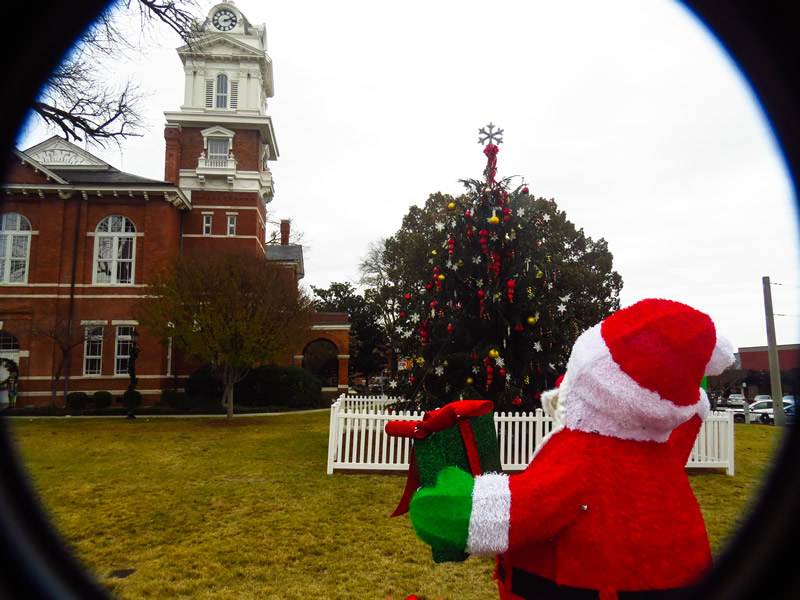THE HISTORIC COURTHOUSE in Lawrenceville is all decorated for Christmas, as Roving Photographer Frank Sharp shows in this photo taken recently on the lawn. Old Saint Nick is present, and the giant Christmas tree is abloom with ornaments. And though it is still November, there are only 27 more shopping days until Christmas, which falls on Tuesday this year.