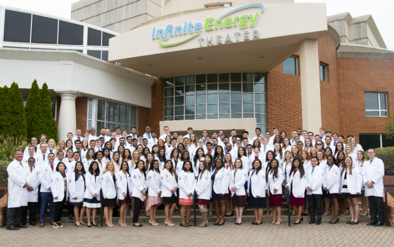 More than 200 doctor of osteopathic medicine (DO) and doctor of pharmacy (PharmD) students at Georgia Campus – Philadelphia College of Osteopathic Medicine (GA-PCOM) in Suwanee, recently received their white coats in formal ceremonies held at the Infinite Energy Theater in Duluth, Georgia.The two ceremonies were attended by faculty members, family and friends of the students who observed the traditional donning of the white coats, a rite of passage symbolic of healthcare professionals’ commitment to their patients and communities. Noting that there were 1,330 days until graduation, Pharmacy Class Chair Brent Chatoff, (PharmD ’22) said, “The white coat is symbolic of our abilities to improve the lives of others. … It is a symbol of hard work, dedication and professionalism” Thinking of the days ahead of them, he added that as a class, “we succeed together, we struggle together and we are there for one another.”