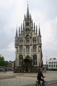 Allan Peel of San Antonio, Tex. was first in, telling us “Gouda, of course, is famous for its cheese. So it is not surprising that at the very heart of the old town is the mid-fifteenth century Gothic Stadhuis (town hall) that is positioned at the center of ‘Gouda’s Markt’ – one of the largest market squares in Holland and scene of a weekly, tourist-orientated, cheese market.  The Gothic Stadhuis is one of the oldest and most impressive Gothic secular buildings in The Netherlands. The old town hall building absolutely looks the part with sculptures, flags, a clarion and colorful shutters. While not as ornate, and as shown in the attached photo, the back of the building is also impressive as it faces the cheese market, lined with plenty of Gouda cheese wheels!”