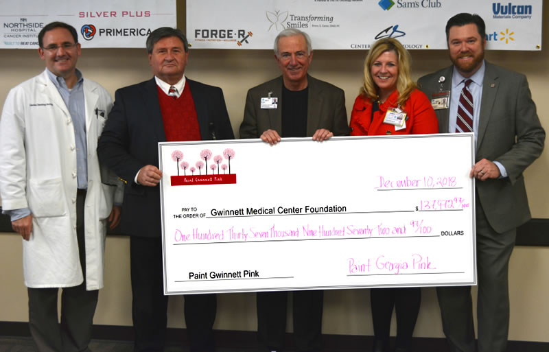 BIG PAINT PINK CHECK: The organizers of Gwinnett Medical Center (GMC)’s third Annual Paint Gwinnett Pink 5K walk/race presented a $137,972.97 check to the Gwinnett Medical Center Foundation.  Since 2016, Paint Gwinnett Pink has raised proceeds to provide access to mammograms, the latest in breast cancer diagnostic technology and patient comfort items during cancer treatment for the community. Stemming from a partnership between Paint Georgia Pink and GMC, it is the largest 5K race in Gwinnett County that supports breast cancer. The 4th annual Paint Gwinnett Pink is scheduled for October 26, 2019. From left are Dr. Kevin Peacock, Medical Center Vice President and COO Thomas Shepherd, GMC’s President and CEO Phil Wolfe, and GMC Vice President of Operations Cathie Brazell.