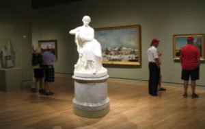 “The central focus of today’s mystery photo is the marble statue of ‘Sappho,’ which was modeled in 1862 and carved in 1867 by William Wetmore Story (1819 – 1895). The oil painting that is directly behind the ‘Sappho’ is ‘Winter Scene in Brooklyn,’ painted by Francis Guy in 1820. The painting presents a view of daily life in Brooklyn, N.Y. at the intersection of Front, James, and Fulton Streets from the window of Francis Guy’s second-floor studio.”