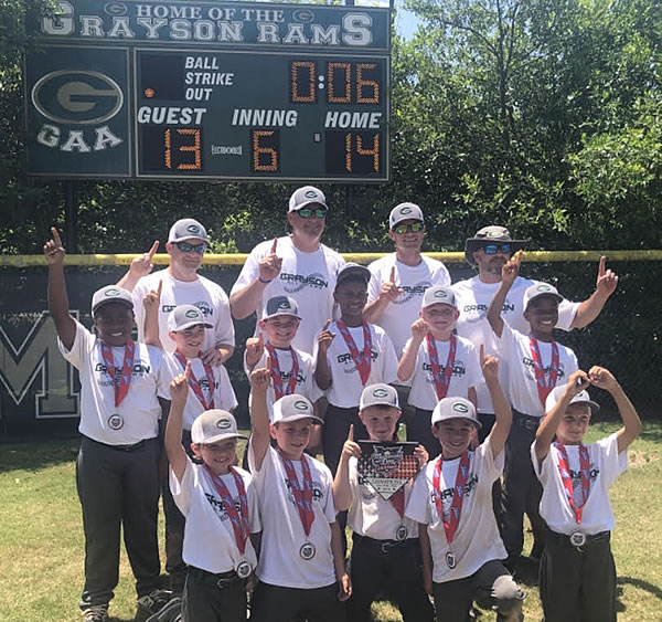 WINS CLASSIC: On Sunday the Grayson Athletic Association’s eight and under All Stars won the Memorial Day Classic held at Bay Creek Park. They came back to beat the Johns Creek Ocee Black team in the tournament’s division championship game. The Grayson Rams eight and under All Stars battled to win 14-13 in record-breaking heat. From left on the back row are Coaches Jamie Crunkleton; David Greene; J.R. Landress; and Jeremy Wood. Players on the middle row include Tripp Durant; Bryce Maclin; Barrett Greene; Austin Leonard; Tanner Smith; and Avery Merchant. On the front row are Jack Crunkleton; Easton Wood; Tristan Landress; Leyton Hale; and Kendall Crespo.