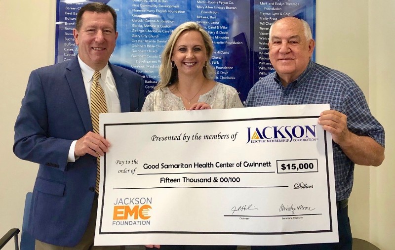 A $15,000 Jackson EMC Foundation check has been presented to the Good Samaritan Health Center of Gwinnett, which will help purchase equipment for the first Quick Clinic in Gwinnett.  At the check presentation are (from left): Randy Dellinger, Jackson EMC district manager; Heni Jordan, Good Samaritan director of development; and Jim Puckett, Jackson EMC Foundation board member.