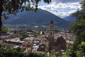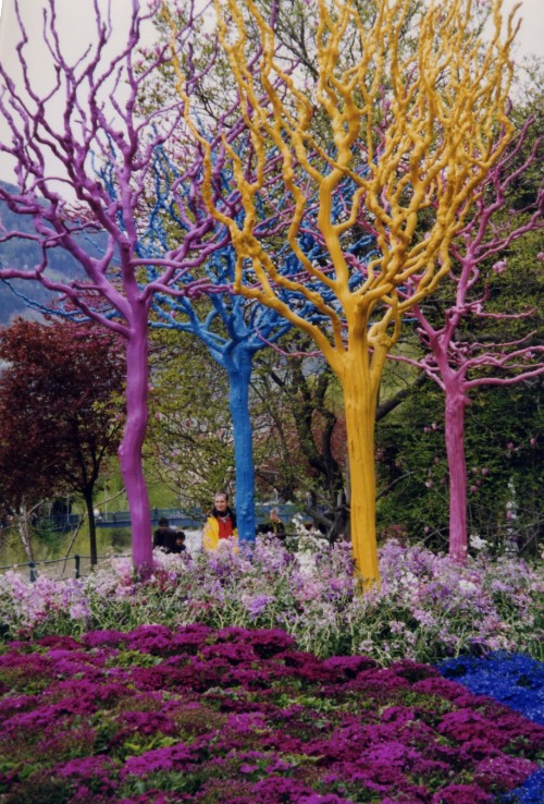 George Graf wrote: “My wife and I spent an Easter holiday in Merano.  I took the photo of the painted trees in a small park off of Via Roma in the city.  Besides these unusual trees, I remember the Summer Promenade and the Winter Promenade in the city.  The former winds beneath gigantic shade trees, and the latter leads past a covered Art Déco portico lined with original paintings and ends up at the feet of an ancient castle, where you can admire a rock garden, waterfalls, ponds and streams.  Merano also hosts an annual International Wine Festival, has many spas, botanical gardens, vineyards, and a concert hall.  It was a really relaxing town with most sites an easy walking distance on vehicle free routes.  I believe it also is nicknamed The City of Flowers in the Dolomites.