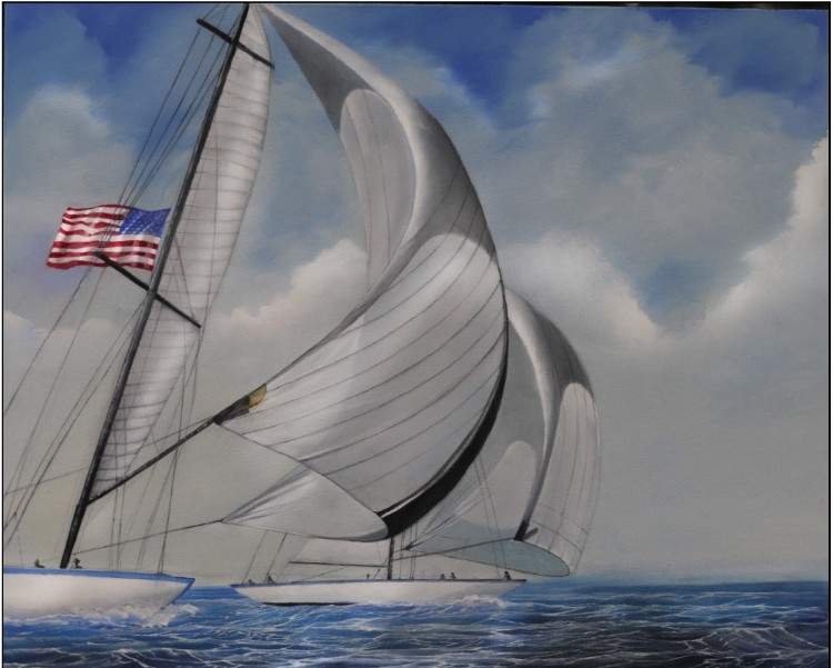 John Fronza, a former Addy Award-winning art and creative director and Vietnam Navy veteran, shows his pride of the Navy and naval heroes in  his work, along with superb craftsmanship.  Spinnaker was inspired by his days of crewing on racing boats in Florida. Another painting, USS George Washington, pays tribute to this ship which was stationed in New York Harbor after 9/11 to provide support to fighter squadrons if necessary; the flags proclaim “Never Forget” and the beams of light in the background represent the ghosts of the twin towers.