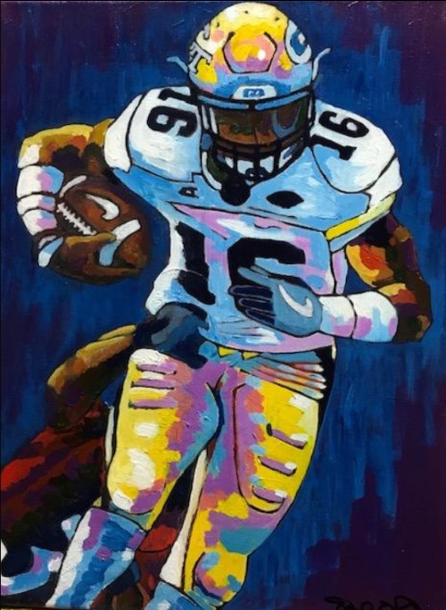 A Naval Academy graduate and engineer inspecting power plants, Paul DiRito was attracted to art by his children, a fashion designer and an architect. He is largely self-taught and uses a limited palette to produce his diverse subjects in paint.  His admiration of the work of Vincent Van Gogh shows in the large oil painting Irises two Gogh, a joyful work. A different, lively style is TaQuon Five (at right) which he says is his fifth study of Georgia Tech quarterback TaQuon Marshall.