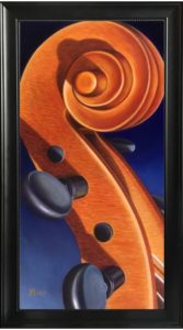 Brenda Ehly is a multi-talented artist of music and visual arts, who taught instrumental music for 16 years and then  began painting. Her painting, On Board was inspired by a childhood chess set. The chess pieces seem to glow out of the depths of the canvas and were designed by a Russian American sculptor, better known as the creator of the rubber ducky. Viola deBraccio (at left) is the artist’s personal viola and this painting portrays the exquisite beauty of the instrument.
