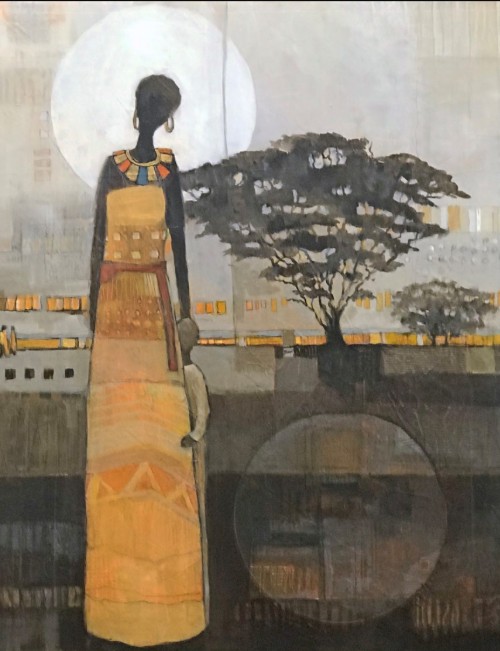 Anne Labaire is a participating artist who first held a crayon in her toddler fist. She joined husband Ron, opening a pottery and gift shop in Norcross. After closing the store, Anne began painting and quickly  outshone competition in that as well. Her sense of design and color harmony dominate all her work. One of her works (at right) is titled Karama (Swahili, “generous gift”),  depicting a statuesque beauty with her child near acacia trees. The setting is Africa and the mother’s love, child, trees, friends, earth and sky are gifts indeed!