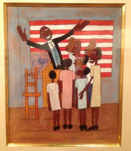 “The theme of the painting is a tribute to the National Hymn called Lift Every Voice and Sing, originally a poem written in 1899 by the NAACP leader James Weldon Johnson (1871-1938) and then set to music by his brother John Rosamond Johnson (1873-1954). Often called ‘The Black National Anthem’, the lyrics deal with the hardship of the African-American experience in America, one that tells African-Americans to ‘keep movin’ on, to keep fighting for freedom.’ The musical version of the hymn was first performed in celebration of President Lincoln’s Birthday on February 12, 1900, by a choir of 500 school children at the segregated Stanton School (Jacksonville, Fla.), where James Weldon Johnson was principal.”