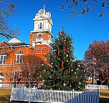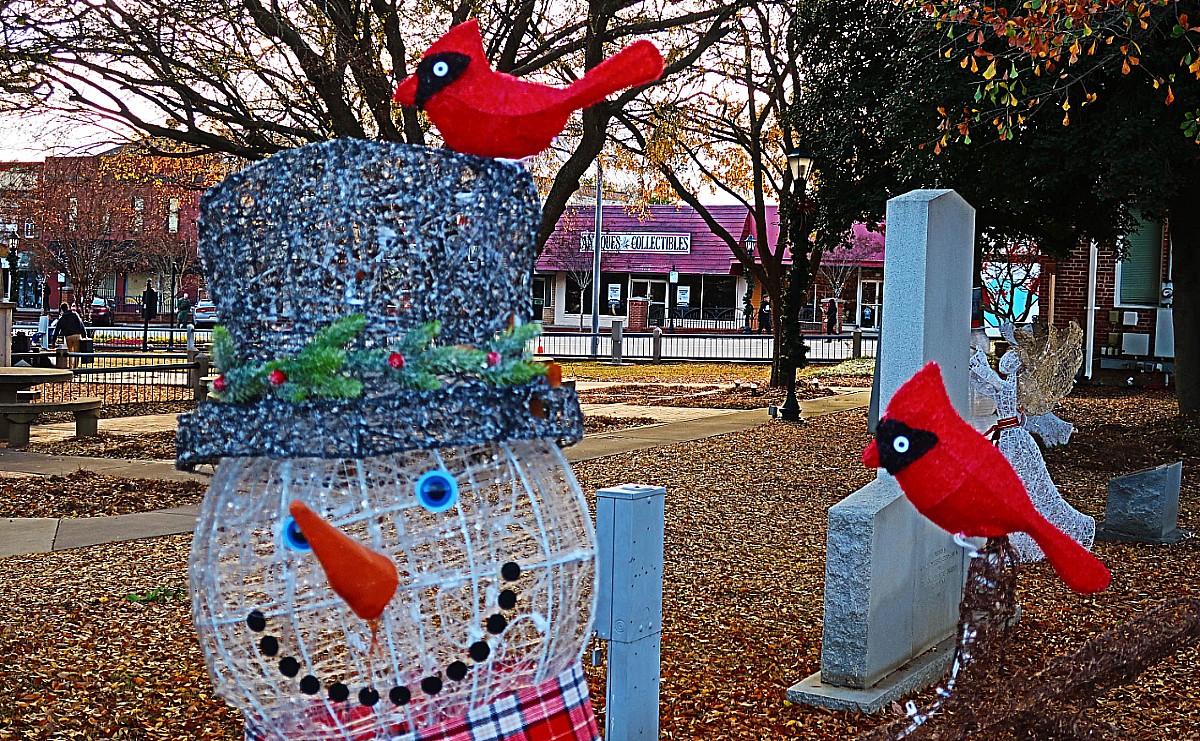 CITIES AROUND GWINNETT are decked out in holiday decorations these days. We liked these cheerful robins perched on a wire snowman and marker on the grounds of the Historic Courthouse in Lawrenceville. On Thanksgiving night, the giant North Carolina spruce (insert) was lighted. (Photos by Roving Photographer Frank Sharp)