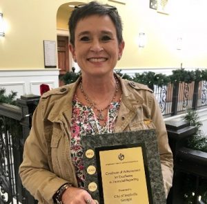 Snellville Controller Jan Burke, pictured at right, has received an award of excellence for preparing the comprehensive annual financial report (CAFR) by the Government Finance Officers Association of the United States and Canada.