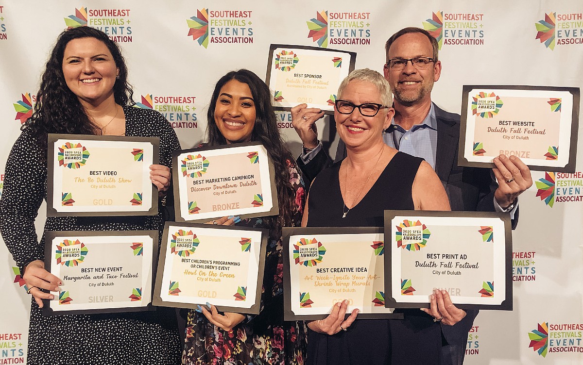 The City of Duluth won eight awards at the Southeastern Festivals and Events Association (SFEA) meeting in Muscle Shoals, Ala. recently. From left holding their awards are Tannis Kufner, Festival Center Coordinator; Kristin Edwards, Events Coordinator; Beth Hoffman, 2020 Duluth Fall Festival Chairperson; and Herb Hoffman, 2019 Duluth Fall Festival Chairperson. One of the awards included the SFEA Kaleidoscope Awards, which recognizes the marketing, programming and overall event, acknowledges the highest level of achievement in the festival and event industry throughout the southeast United States.