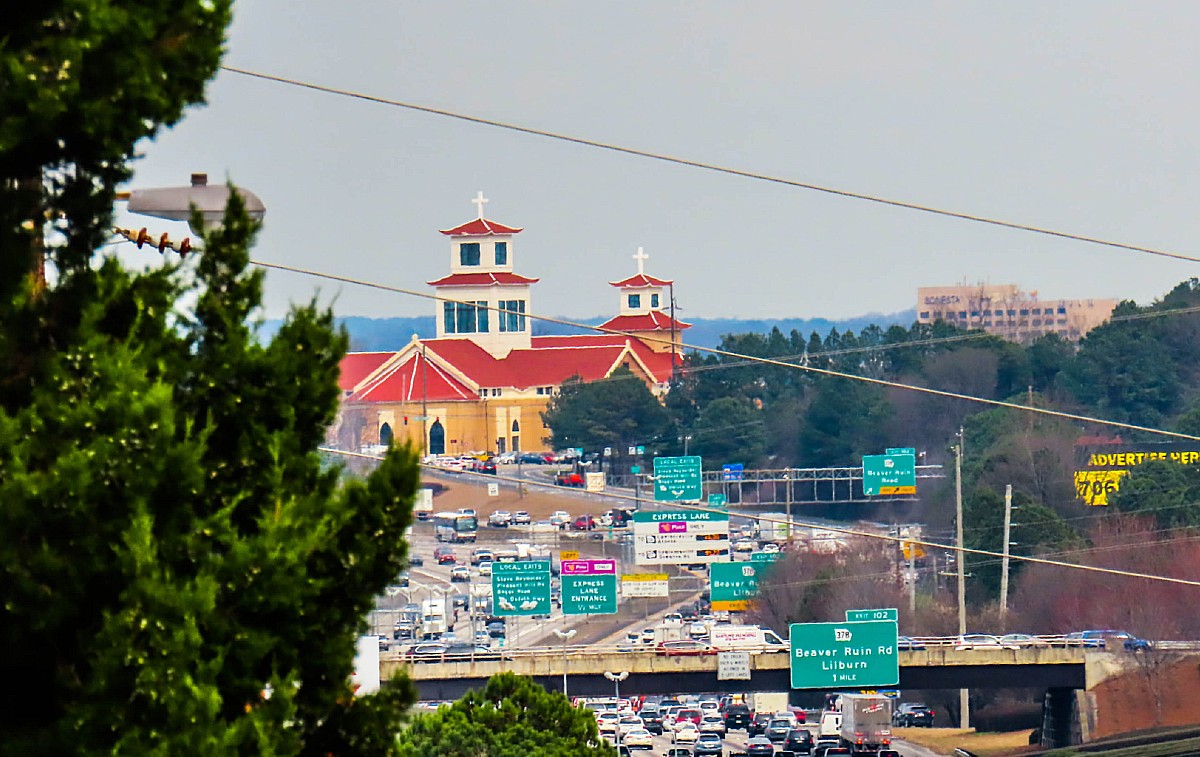 Here’s another way to view the Holy Vietnamese Martyrs Catholic Church at Interstate 85 and Beaver Ruin Road, this long view taken by Frank Sharp. The constant flow of traffic contrasts with the beauty and serenity when you are in the gardens of the church.