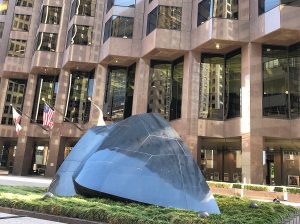 “As can be seen in the mystery photo, the plaza on the north side of the building contains a 200-ton, black Swedish granite sculpture by Masayuki Nagare called ‘Transcendence.’ Even though the sculpture is shaped like a human liver, the monolith earned a new nickname after San Francisco Chronicle columnist Herb Caen dubbed it the ‘Banker’s Heart.’ The name suited the slick and muscular piece of art, and it stuck with the locals. Though Bank of America moved its headquarters to Charlotte, N.C. in 1998, it clearly ‘left its heart in San Francisco!’