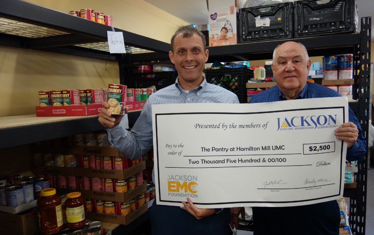 FOR FOOD MINISTRY:  A $2,500 Jackson EMC Foundation check to the Hamilton Mill United Methodist Church Food Pantry will help purchase food for its weekend food distribution ministry.  At the check presentation are (from left): Ryan Jones, HMUMC food pantry manager, and Jim Puckett, Jackson EMC Foundation board member. For more details on this and other details of the EMC award of checks, see Upcoming below.
