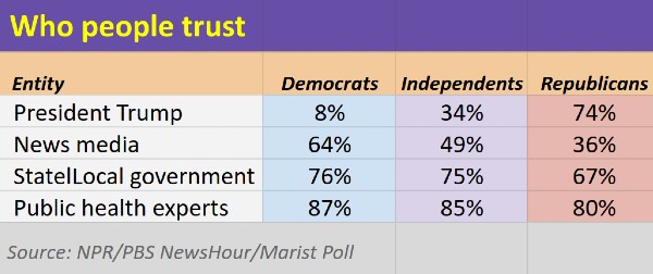 PEACHTREE CITY, Ga.  | Certainly, there has been a difference in messaging between infectious disease experts such as Dr. Fauci of the National Institute of Health, an impartial authority…and our esteemed president. A new NPR/Marist survey (3-17-20) is out which shows differences of opinion as to who to trust are great between Democrats, Republicans and independents. These differences are especially stark when it comes to the president.