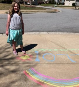 From Susan McBrayer, Sugar Hill: Let me recommend something that has brought smiles to us and our neighbors. Tim and I are semi-retired and have not been off our property in three weeks except to pick up curbside groceries. However, we are now realizing that the young families in our neighborhood think we are ancient and decrepit, so we wanted to send some kind of lighthearted message to let them know we are OK and quite cheerful in our isolation. I reached out to an eight-year-old neighbor, Emma Waldren, and asked her if she would like to create some kind of artwork in our driveway. I thought it might be fun for her and it would definitely be a nice thing for us and the neighborhood walkers. Emma accepted the challenge. We now have a beautiful, colorful chalk message of “Hello” with flowers and a rainbow across the bottom of our drive. Just the ticket!”
