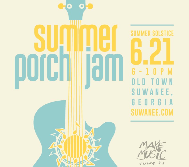 POSTER WINNER: The Suwanee Summer Porch Jam poster is the winner of the Best Layout category in the annual poster competition from Sunshine Artist magazine. The overall design of the poster was inspired by the lighthearted feel of a warm summer day in the south. Summer Porch Jam is the City of Suwanee throwback summer block party complete with food trucks, beverages, and musicians playing al fresco throughout Old Town Suwanee. The brainstorm and art direction for the poster was handled in-house. Veugeler Design Group, a design partner of the city, executed the design. Porch Jam is usually in June, but may not take place in 2020.
