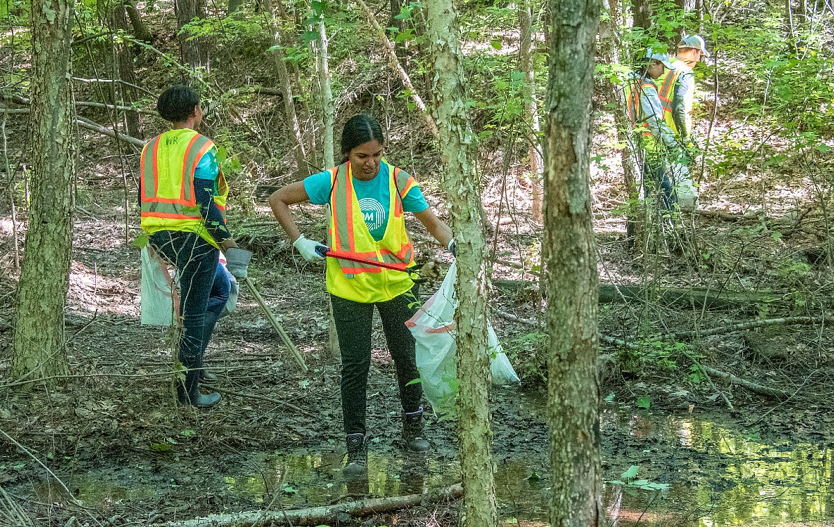 FEEL COOPED UP as a family with little to do during this pandemic? Expand your energies and get involved with Gwinnett in a positive way: help make the county cleaner and prettier.  Gwinnett Clean and Beautiful offers you two options: clean up a roadway, or a stream. Here two employees with AECOM are cleaning up Bromolow Creek during our 2019 Great Gwinnett Wetlands event.  For more details, see Upcoming below.