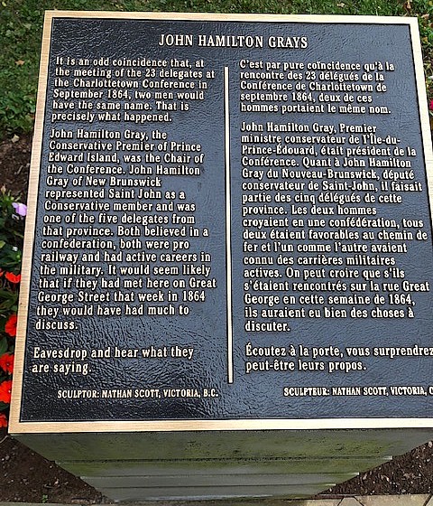 “The figure on the left in the statue is John Hamilton Gray (1814–1889), a Conservative and the Premier of New Brunswick from 1867 to 1872. The figure on the right (the one wearing the top hat) is John Hamilton Gray (1811 – 1887), a Conservative Reformer and the Premier of Prince Edward Island from 1863 to 1865. Gray from P.E.I. was also the chairman for the 1864 Charlottetown Conference. According to Scott, the statue depicts a snapshot in time when John Hamilton Gray of New Brunswick (on the left) was doing a sales job on John Hamilton Gray of P.E.I. about the Confederation.