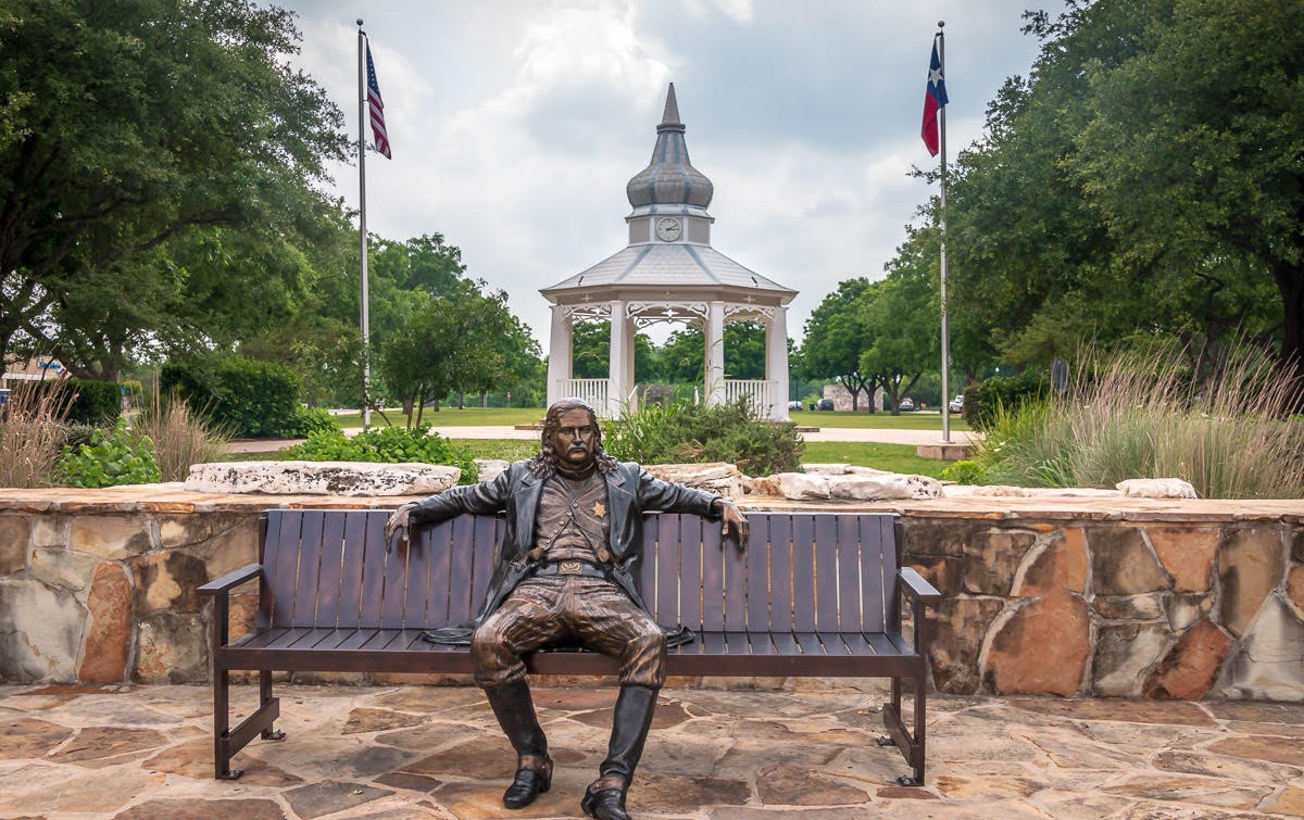 “The statue shows him wearing a shirt, vest (with badge), and jacket. He is sporting pistols on both hips with the butts facing outwards. He is wearing pants and knee high boots. His hair is shoulder length. He is sporting a large mustache. Main Plaza is in the heart of Boerne and serves as the site of numerous festivals, concerts, car shows, and celebrations. The park features a gazebo, which serves as a location for weddings and concerts.”