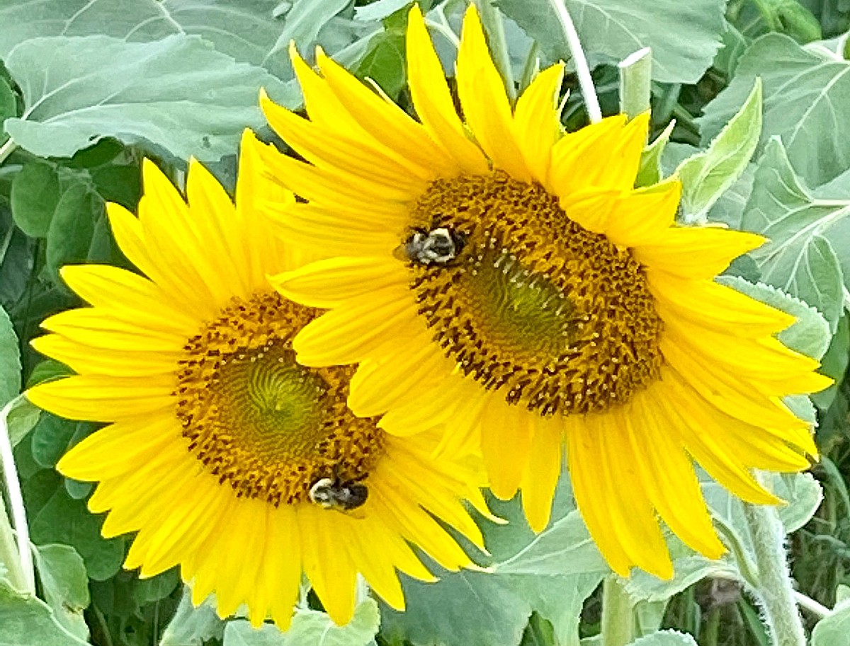 BEES AT WORK, and note, they are not wearing masks. Roving Photographer Frank Sharp took this close-up with his new iPhone camera at the Anderson Sunflower Farm, located north of Georgia 400 and south of Cumming on Shiloh Road. The farm is at the peak season of sunflower blossoms these days, and makes for a great nearby get-away!