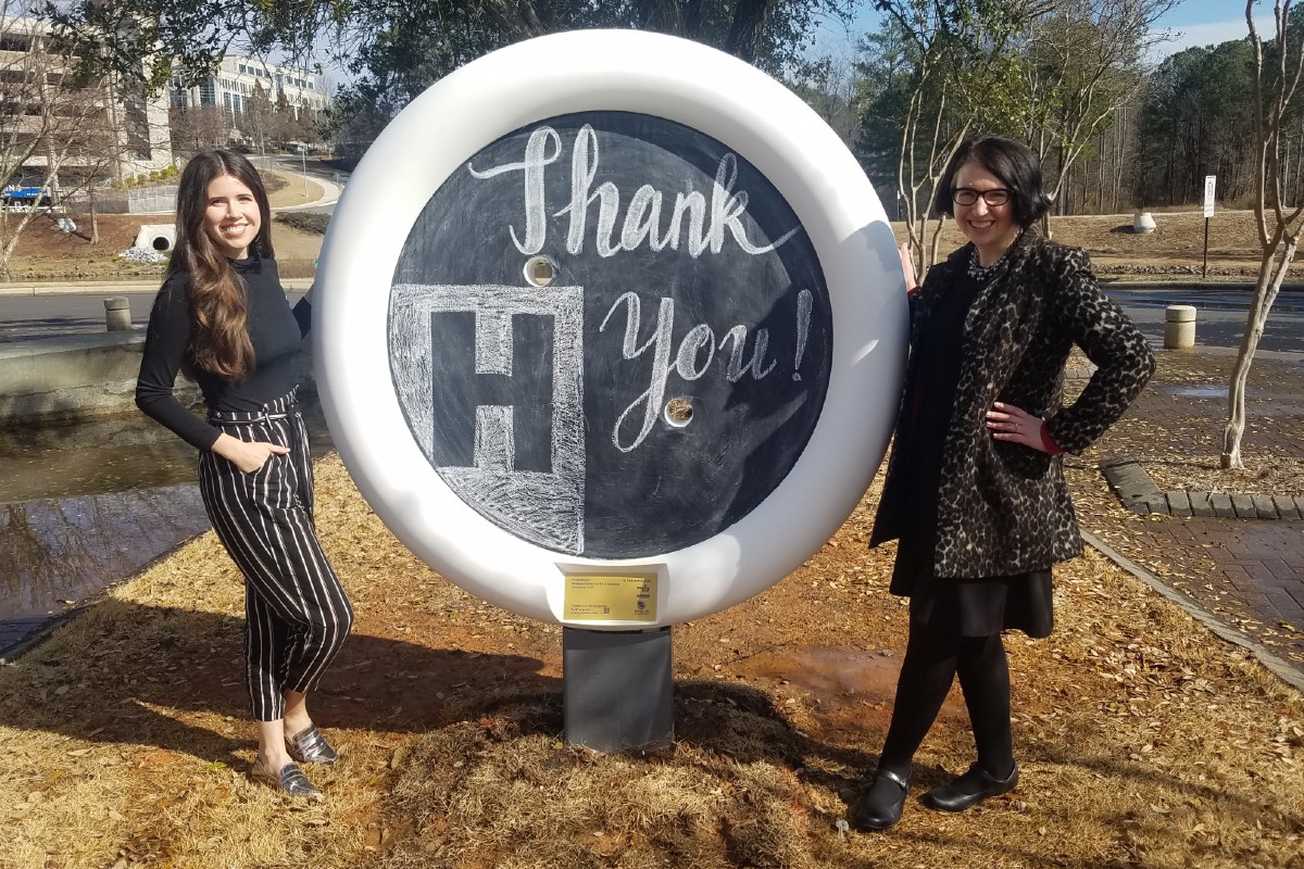Two Button sculptures have been installed at the Infinite Energy Center. This is part of a grant awarded by the Gwinnett Creativity Fund to install these commemorative Buttons around the county.The piece “JAZZ”, by artist Bill Stevens was selected by the team at Sugarloaf CID. An interactive chalkboard Button Sculpture was installed outside of the Hudgens Center for the Arts. From left at one of the Infinite Energy Center Buttons are Kate Driscoll (Public Programs Manager, The Hudgens Center for Art and Learning), and Laura Ballance (Executive Director, the Hudgens Center for Art and Learning). Button Art, Inc. seeks to install 200 original Button Sculptures throughout Gwinnett County. This art project was inspired by Gwinnett County’s 200th birthday celebration.