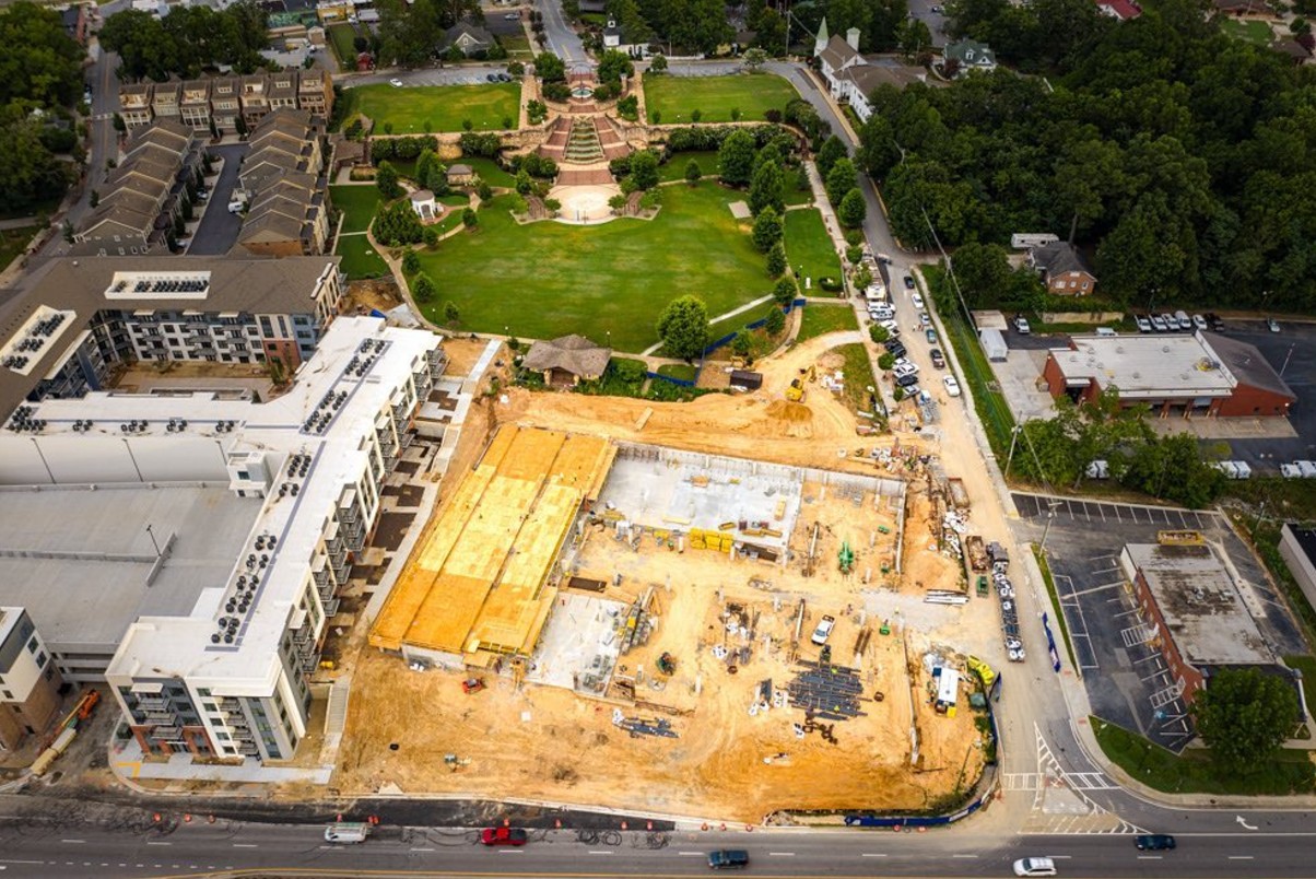 THIS AERIAL PHOTOGRAPH gives you an understanding of the site of the new Norcross library, anticipated to be open by the end of October. The building is adjacent to Buford Highway, while the vehicle entrance of the library turns off Brett Avenue, in the center of this photo at the right side. The green plot in the center is Lillian Webb Park. Left of the library site are the Brunswick Apartments. To read about this walking tour through the yet-incomplete library, go to Elliott Brack’s Perspective below.